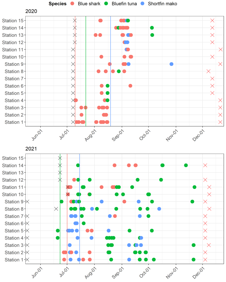 Colored circles indicate when that species was observed at a given receiver. Colored vertical lines represent the time individuals of each species were first tagged in each year. The black “X” represents the time when the receiver was deployed, and the red “X" represents the time it was removed for the season.